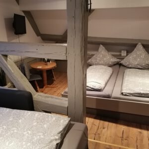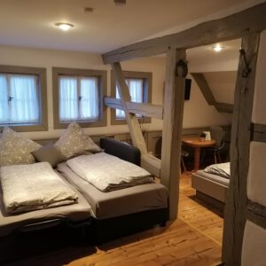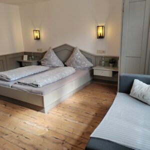 Die großzügigen, freistehenden Doppelbetten in 180x200m ohne Fußteil sind ideal auch für groß gewachsene Gäste. Die Couch ist auch bequem als 3. Bett ausziehbar und somit können hier Familien auch gerne zu Dritt komfortabel ihre Zeit verbringen. Optional wäre auch hier ein Beistellbett oder Babybett möglich und somit auch mit 4 Personen belegbar. Alle Zimmer der Kategorie Silvaner verfügen über ein Tageslichtbad. Sollten Sie konkrete Wünsche haben, ob Dachzimmer mit uriger Balkendecke oder besser Silvaner im 1. OG mit geräumigem Badezimmer und Doppelwaschtisch – teilen Sie uns ihre Wünsche gerne bei der Reservierung mit.