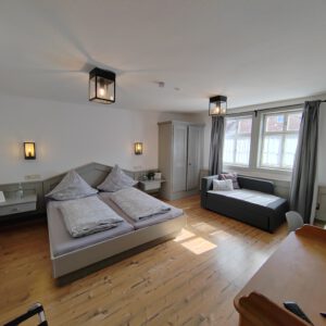 Zimmerkategorie Deluxe FamilienzimmerUnsere geräumigen Deluxe Familienzimmer bieten viel Platz für entspannte mehrtägige Aufenthalte für Paar mit zusätzlichen Sitzgelegenheiten im Zimmer, die gemütliche Couch lädt zum Entspannen ein.
